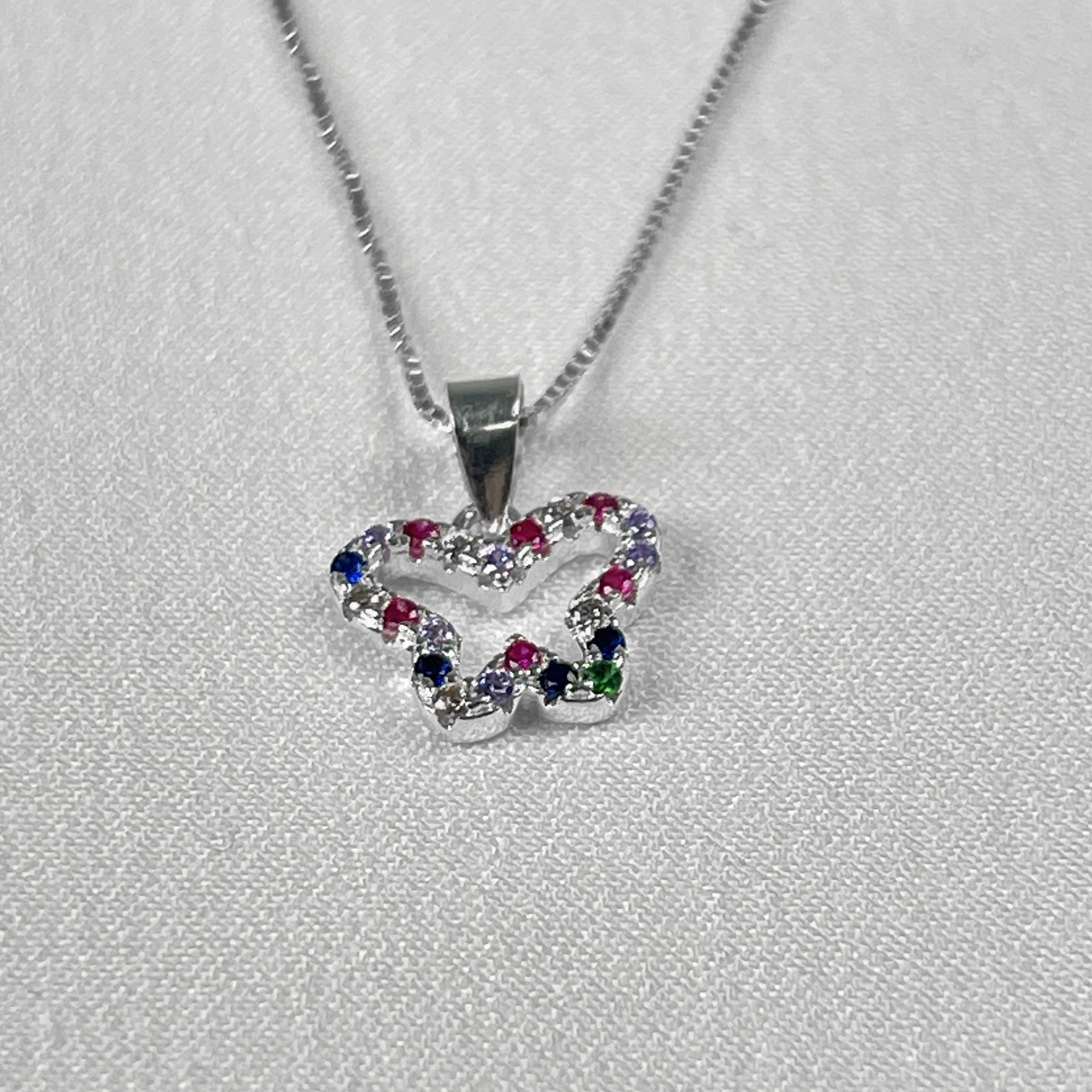 Colar borboleta colorida em Prata 925, com acabamento refinado e design leve. Uma joia charmosa e feminina, perfeita para uso diário.