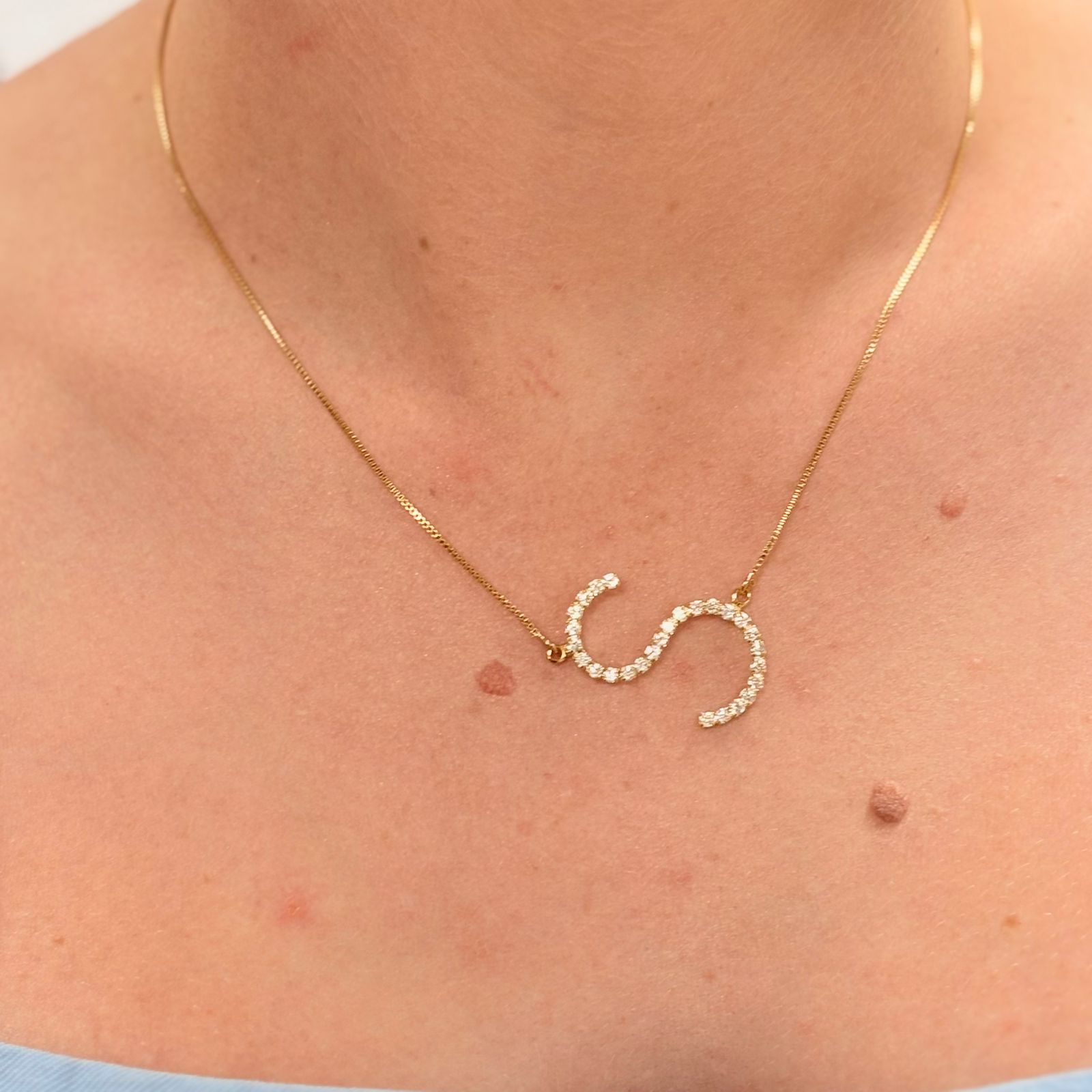 Colar letra S cravejado no dourado, semijoia personalizada com pedras que garantem brilho e sofisticação ao visual.