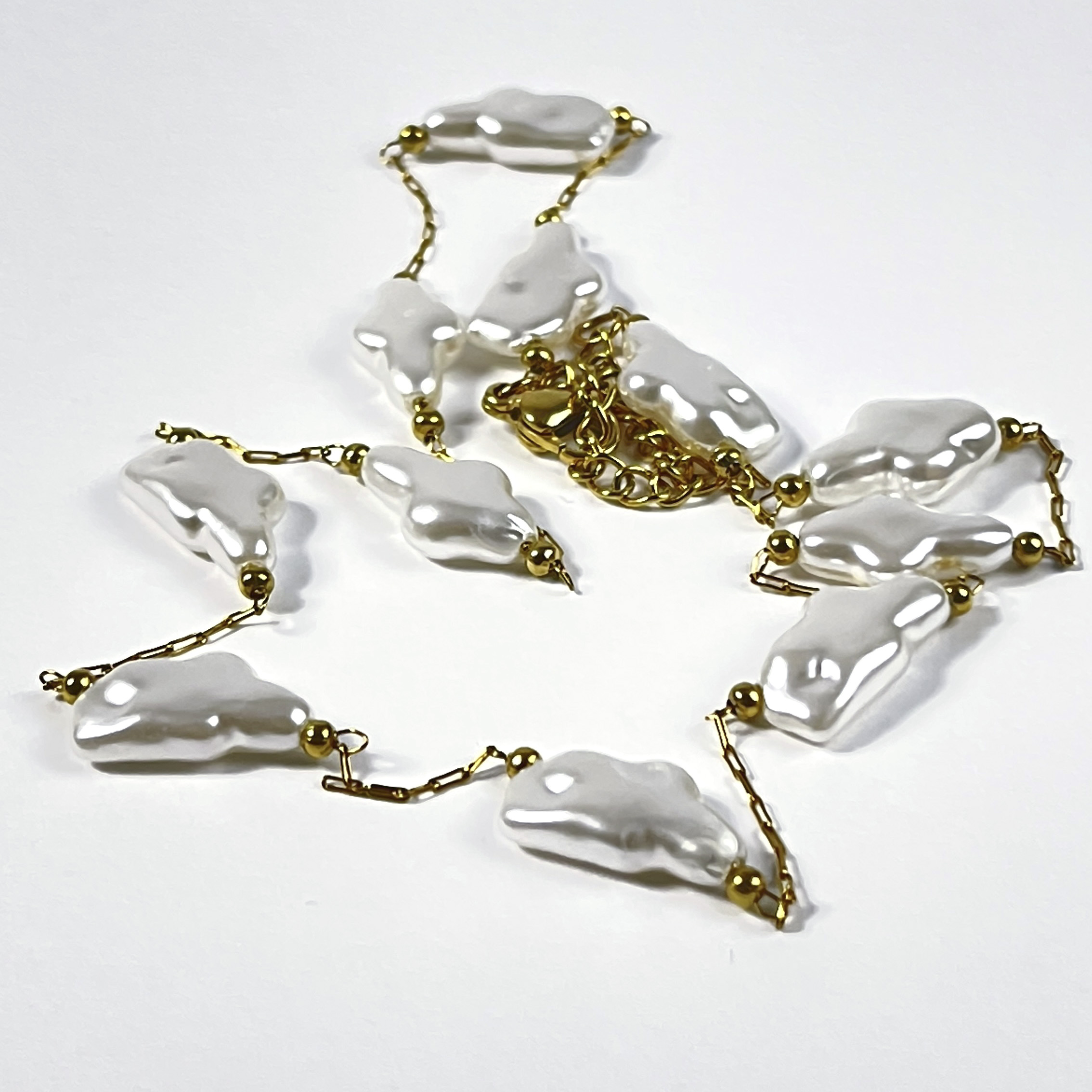 Colar pérolas barrocas no dourado, semijoia sofisticada com design clássico, perfeita para quem aprecia elegância atemporal.