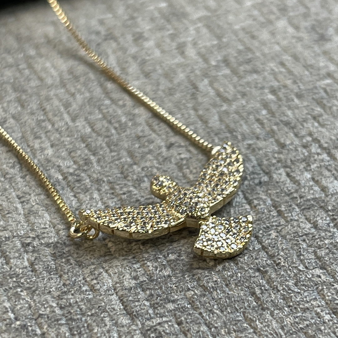 Colar pingente Espírito Santo cravejado no dourado, semijoia religiosa que une fé, elegância e brilho sofisticado.