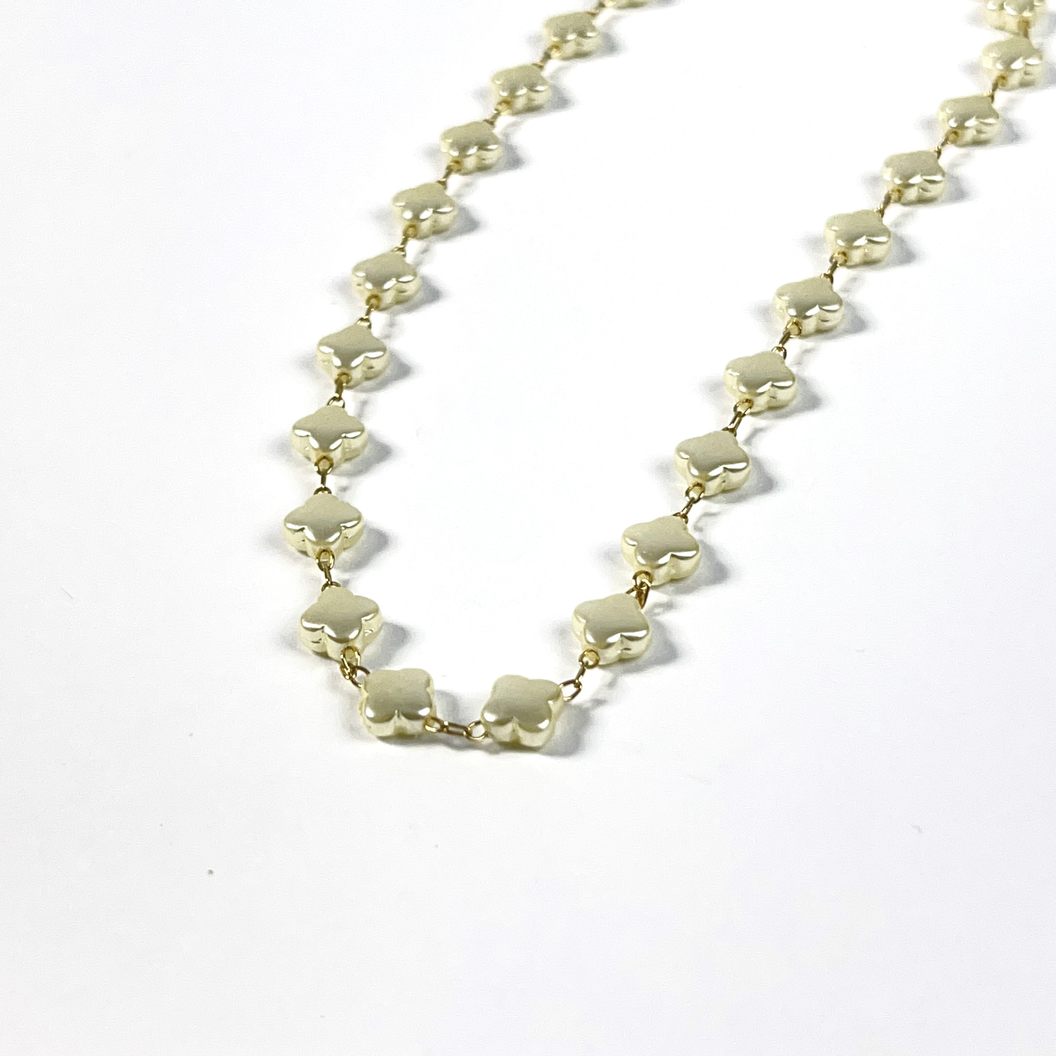 Colar trevos com pérolas no dourado, semijoia sofisticada que une simbolismo e elegância, perfeita para composições clássicas e femininas.