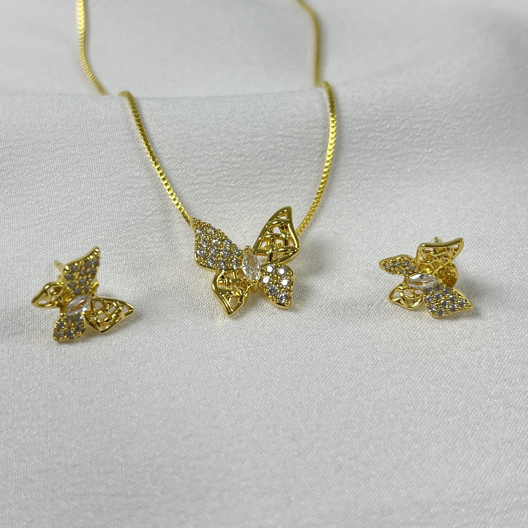 Conjunto borboletas cravejado, semijoia sofisticada com pedras que valorizam o brilho e o design delicado das peças.