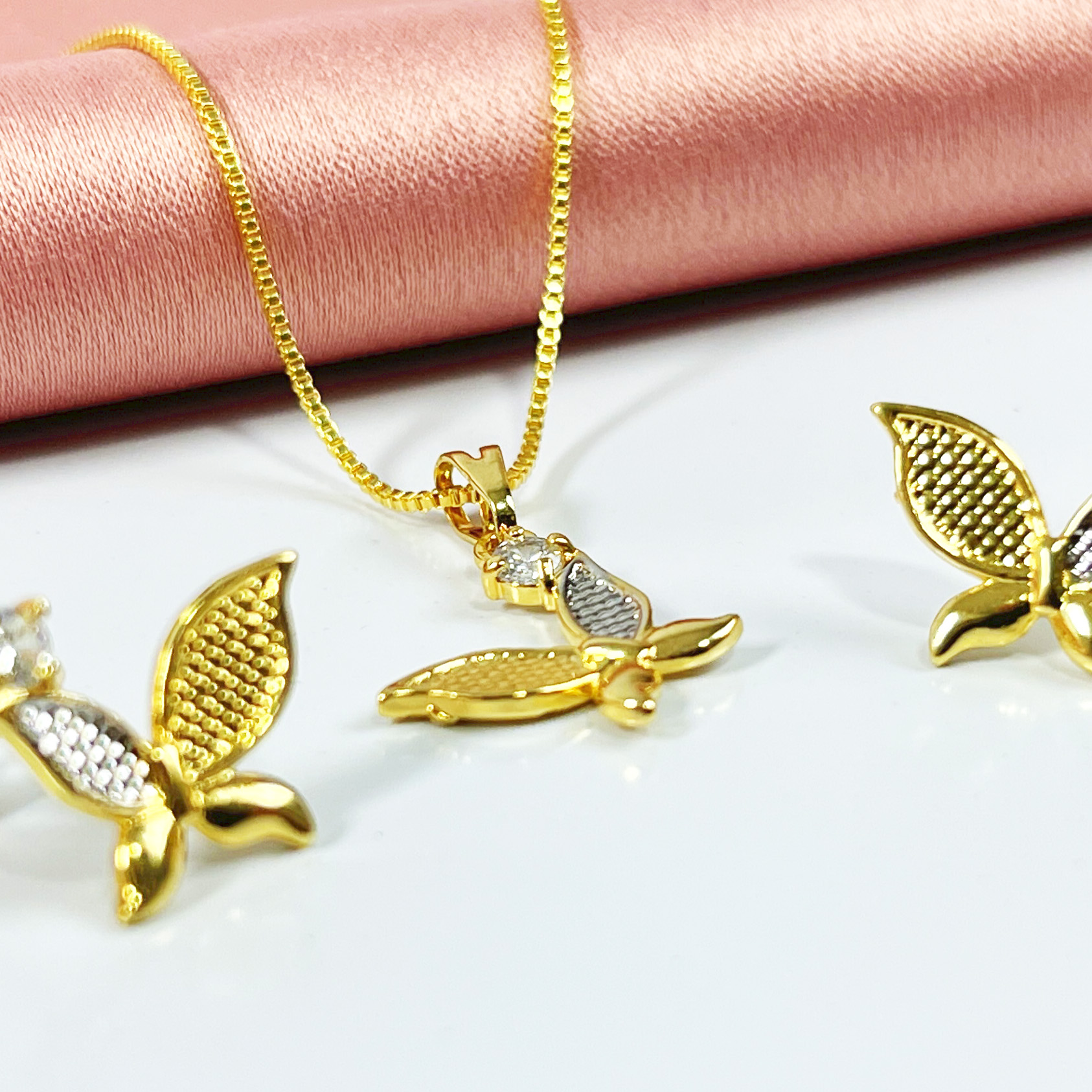 Conjunto borboletas douradas com prata, semijoia que combina dois tons nobres, oferecendo versatilidade e sofisticação.