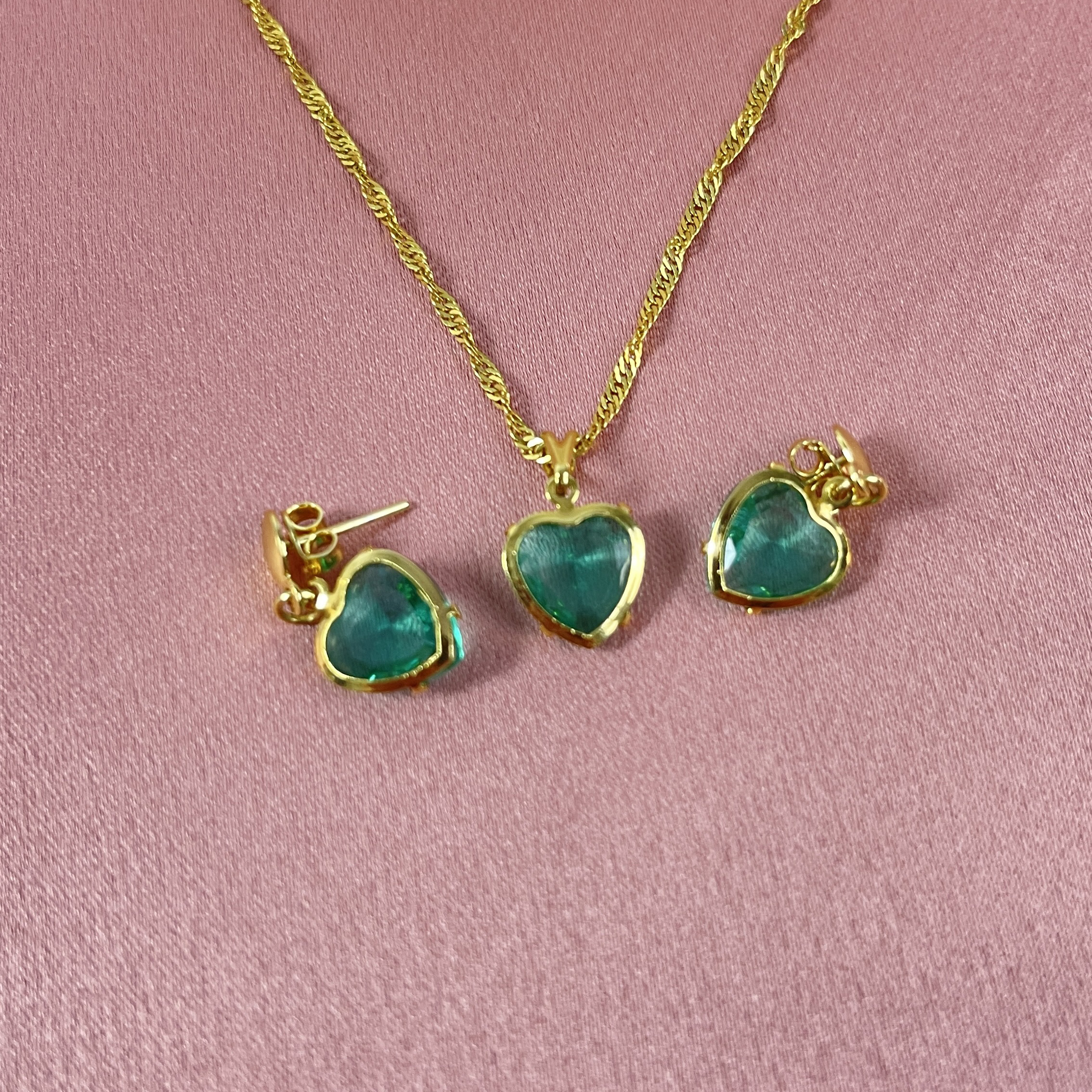 Conjunto de colar e brinco com pedra coração verde água, semijoia charmosa e feminina, com tonalidade suave que transmite frescor, elegância e delicadeza.