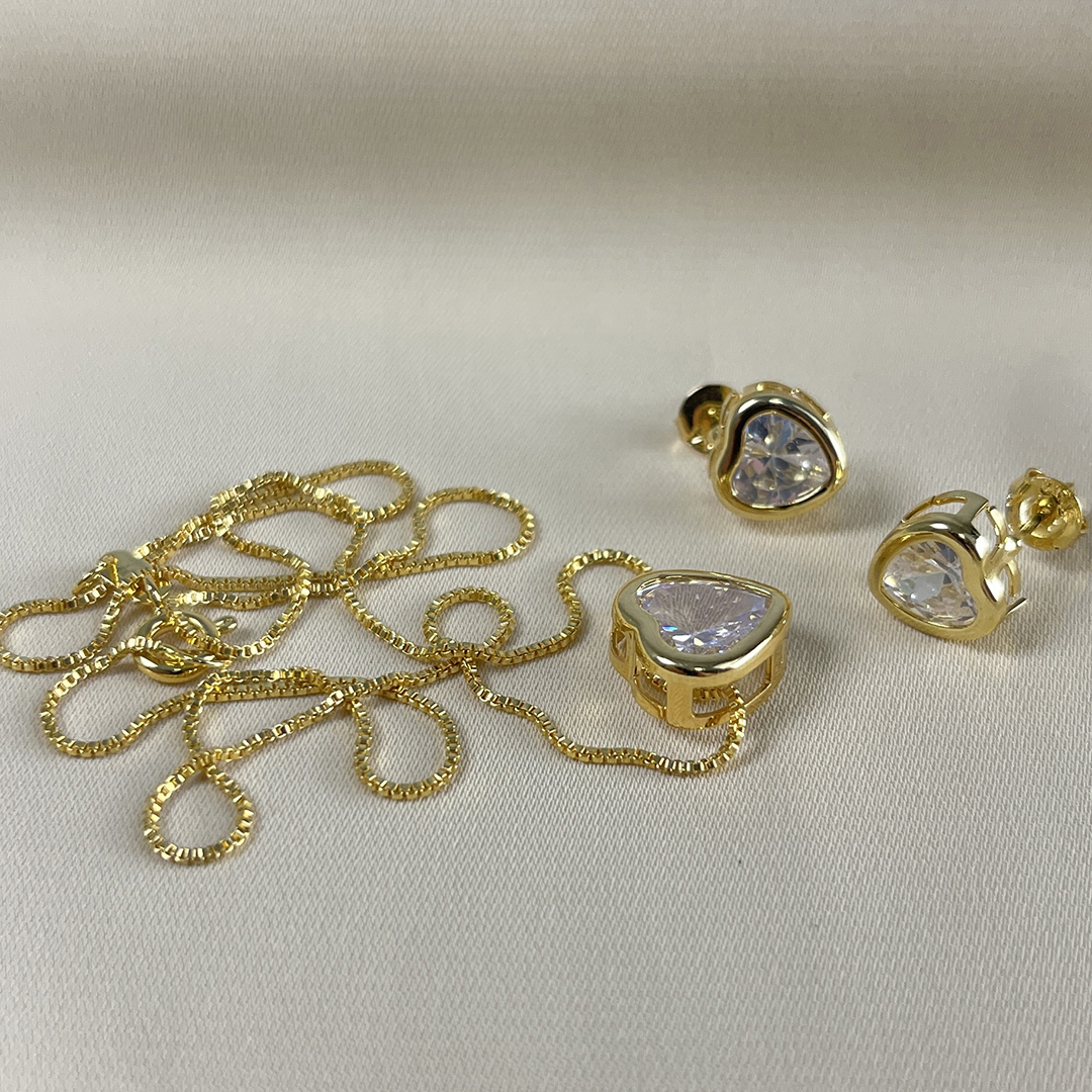 CONJUNTO CORAÇÃO ZIRCONIA DOURADA - SEMIJOIA