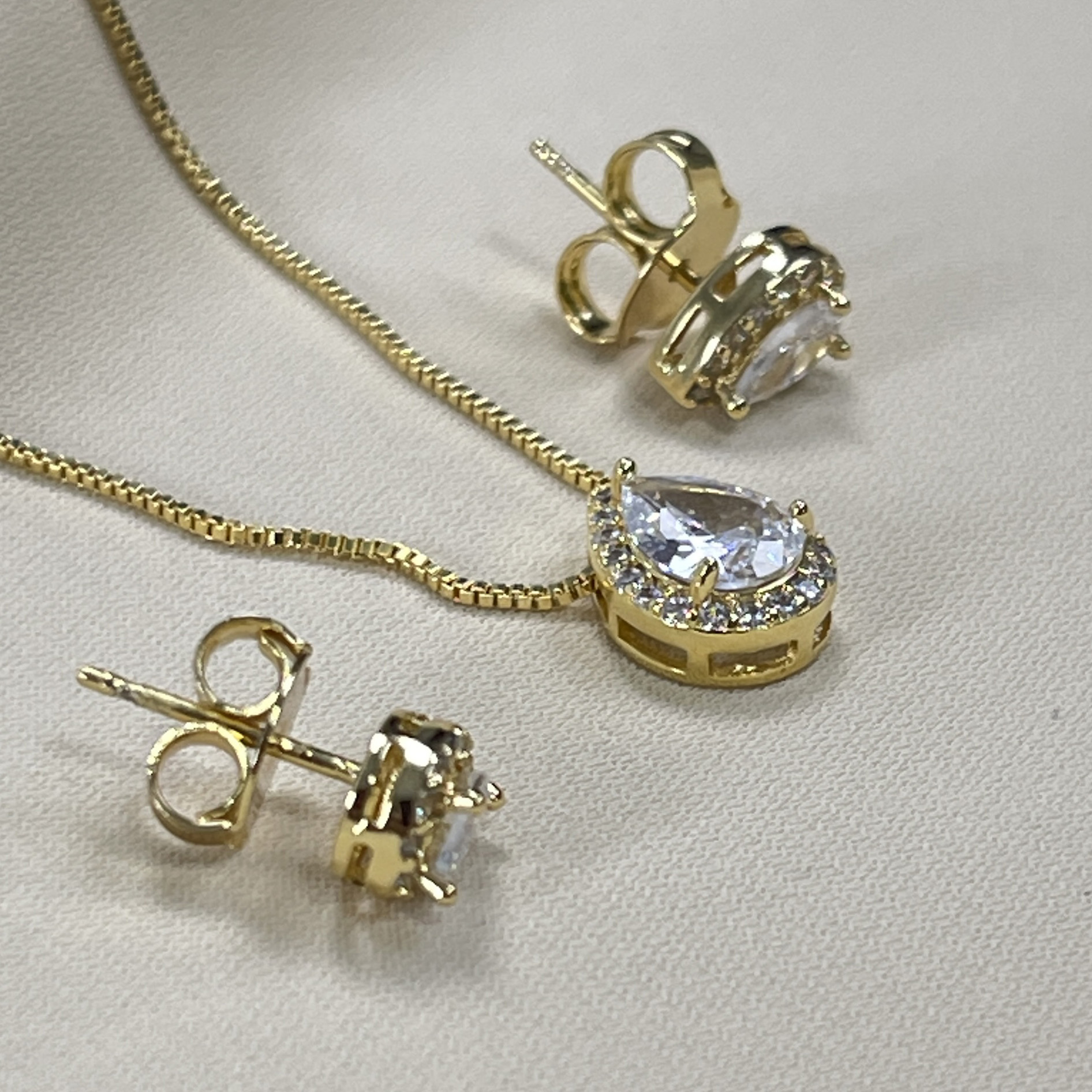 Conjunto Gota Cristal Dourado - Brilho Atemporal Eleve o seu estilo com a transparência e o brilho do nosso Conjunto Gota Cristal. Composto por colar e brincos, este conjunto traz um cristal central impecável em formato de gota, abraçado por um banho dourado de alta intensidade. É a peça perfeita para quem busca iluminar o rosto com elegância, sendo ideal tanto para noivas e madrinhas quanto para mulheres que desejam um toque de luxo no cotidiano.