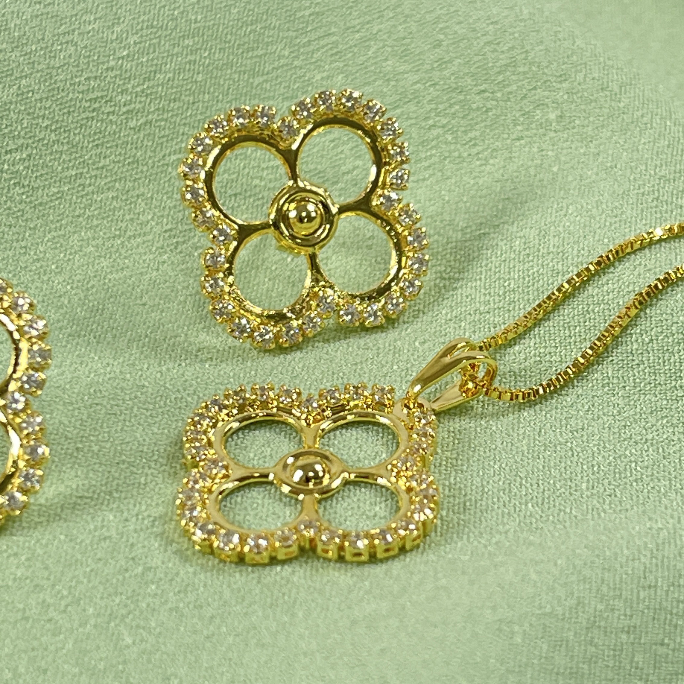 Conjunto Flor Cravejada Dourado - Brilho Incomparável Ilumine seus momentos especiais com o Conjunto Flor Cravejada da Relika Semijoias. Este duo de colar e brincos apresenta um design floral delicado, onde cada pétala é meticulosamente cravejada com cristais de alto brilho, capturando a luz de todos os ângulos. O acabamento dourado premium eleva a peça ao status de alta joalheria, sendo a escolha ideal para festas, casamentos ou para quem não abre mão de brilhar no dia a dia.