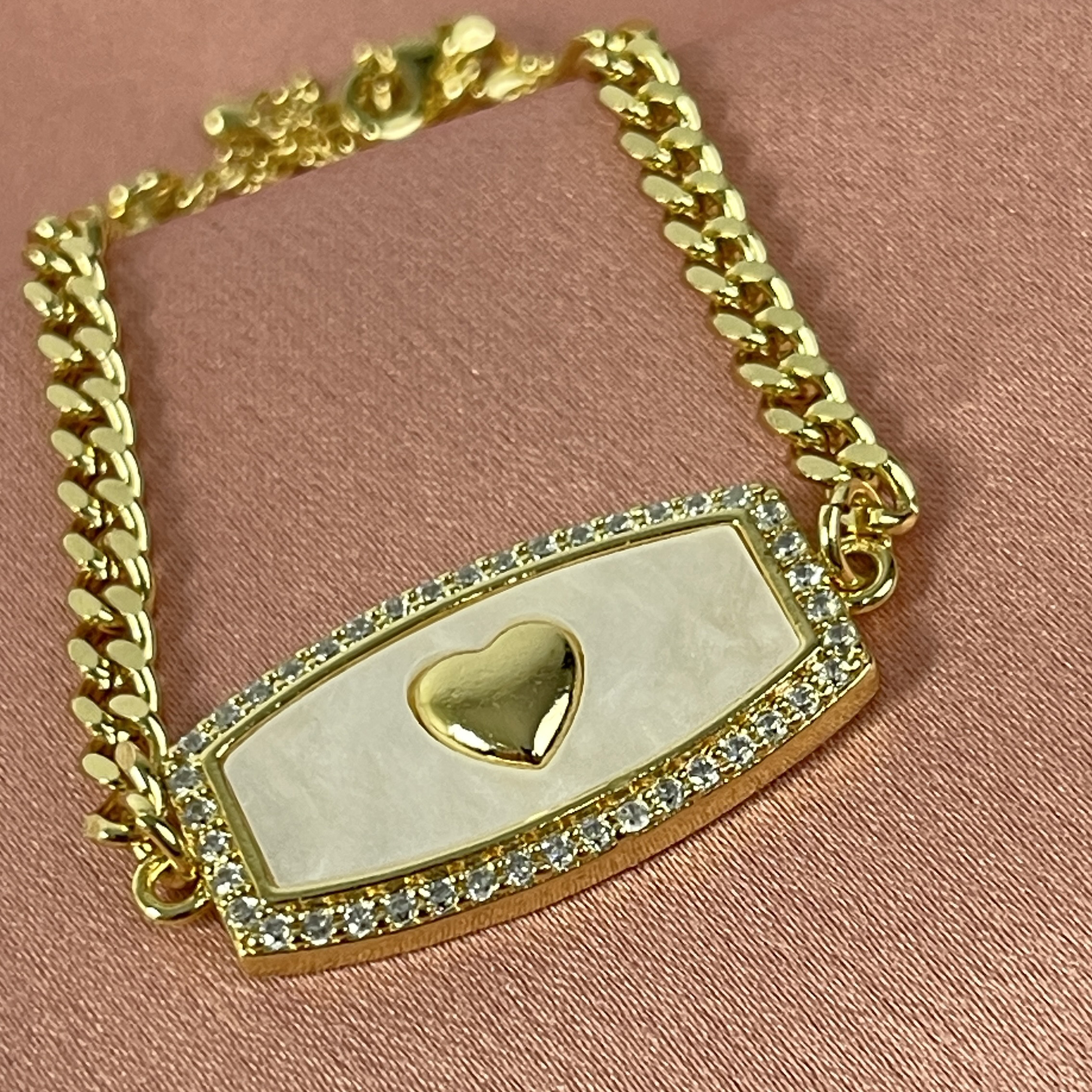 PULSEIRA ELOS COM CHAPA CORAÇÃO ZIRONIA NO DOURADO - SEMIJOIA